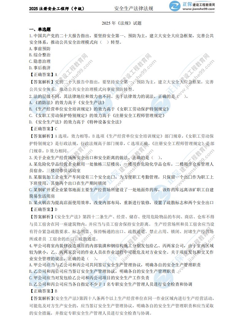 2025年中級安全工程師《法律法規》考試結束,考生們最關(guān)心的肯定是這一科目試題及答案。建設工程教育網(wǎng)考后會(huì )依據考生反饋,及時(shí)匯總中級安全工程師《法律法規》的試題及答案,期望能給各位考生提供幫助!