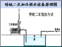 傳統的供水設備基本上是對無(wú)壓水進(jìn)行加壓,以得到所需的流量和揚程,而現在的水源有很大部分是自來(lái)水管網(wǎng),其水壓大多在0.15MPa以上。,通常把帶壓水放入水池得到無(wú)壓水,再經(jīng)設備加壓送到用戶(hù)。在這個(gè)過(guò)程中,自來(lái)水管網(wǎng)水的壓力被浪費了,自來(lái)水管網(wǎng)直接向大氣開(kāi)口,管網(wǎng)的壓力要降低;并且在開(kāi)口水池中造成了二次污染。