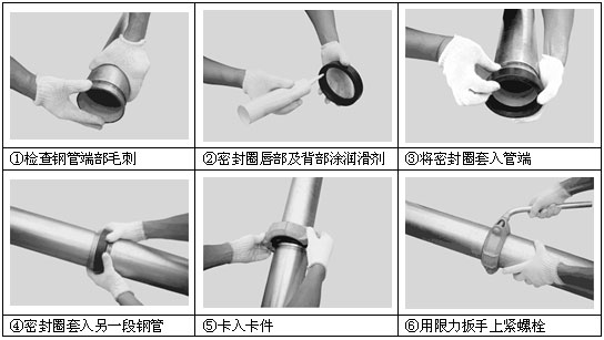 、贆z查鋼管端部毛刺 ②密封圈唇部及背部涂潤滑劑 ③將密封圈套入管端