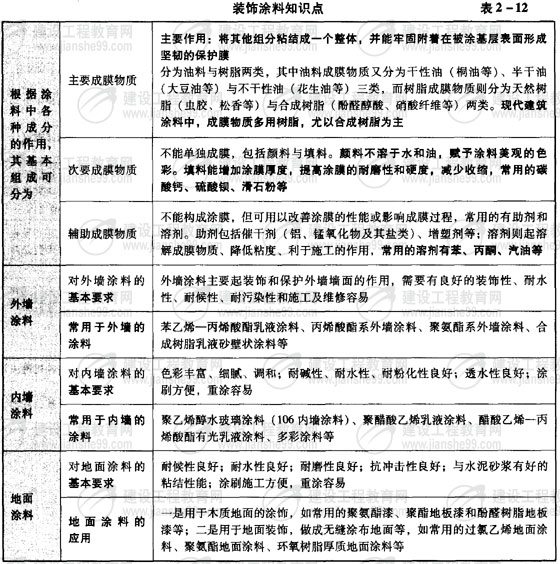 三、裝飾涂料的組成、分類(lèi)、特點(diǎn)及適用范圍(表2-12)