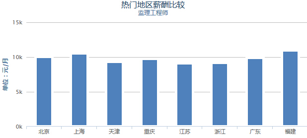 北上廣加上沿海省份都是監理工程師的熱門(mén)地區。薪資情況:北京:10013元、上海:10543元、天津:9323元、重慶:9763元、江蘇:9143元、浙江:9145元、廣東:9871元、福建:10929元。