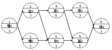雙代號網(wǎng)絡(luò )圖(箭線(xiàn)式網(wǎng)絡(luò )圖)——以箭線(xiàn)及其兩端節點(diǎn)的編號表示工作;同時(shí),節點(diǎn)表示工作的開(kāi)始或結束以及工作之間的連接狀態(tài)。