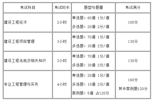 《建設工程經(jīng)濟》考試時(shí)間為2小時(shí),《建設工程項目管理》考試時(shí)間為3小時(shí),《建設工程法規及相關(guān)知識》考試時(shí)間為3小時(shí),《專(zhuān)業(yè)工程管理與實(shí)務(wù)》考試時(shí)間為4小時(shí)。