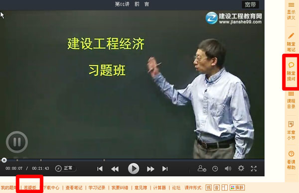 方法二:在視頻講座聽(tīng)課頁(yè)面,點(diǎn)擊右側的【隨堂提問(wèn)】按鈕或底部的【答疑板】按鈕即可: