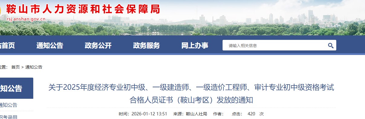 2025年度經(jīng)濟(jì)專業(yè)初中級(jí)、一級(jí)建造師、一級(jí)造價(jià)工程師、審計(jì)專業(yè)初中級(jí)資格考試合格人員證書(鞍山考區(qū))定于2026年1月13日開始發(fā)放,現(xiàn)將有關(guān)工作安排通知如下: