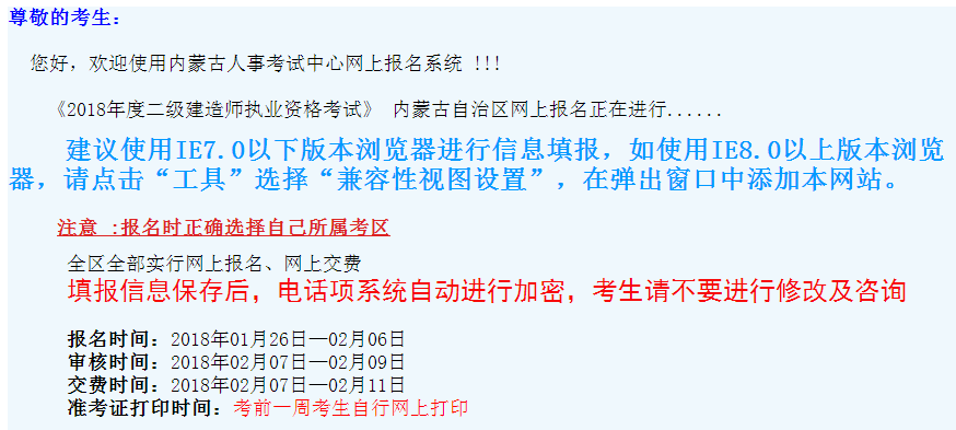 考務(wù)文件:內蒙古2018年度二級建造師執業(yè)資格考試報名的通知