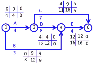 某住宅工程,磚混結構,地上7層。項目經(jīng)理將整個(gè)施工任務(wù)劃分成5個(gè)工作(A、B、C、D、E)。編制了施工進(jìn)度計劃雙代號網(wǎng)絡(luò )圖如下(單位:月)