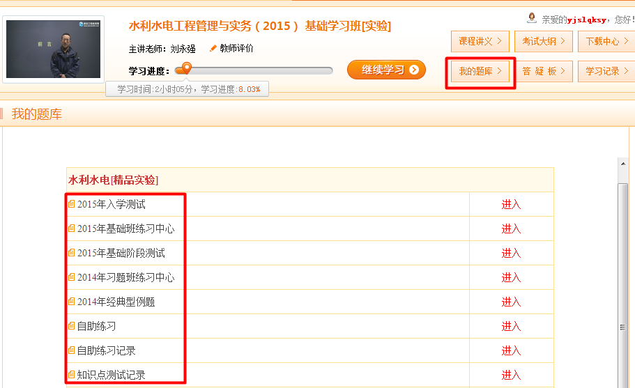 登錄“我的網(wǎng)校我的家”→點(diǎn)擊“題庫”→進(jìn)入“我的題庫”界面→進(jìn)行練習