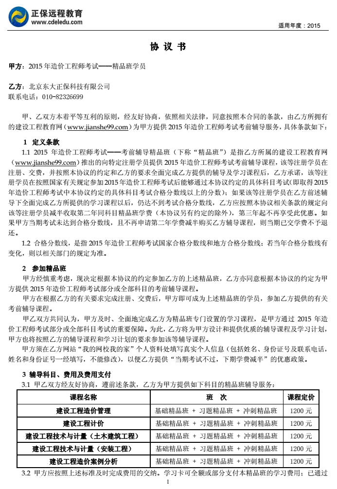 造價(jià)工程師“精品班”協(xié)議書(shū)