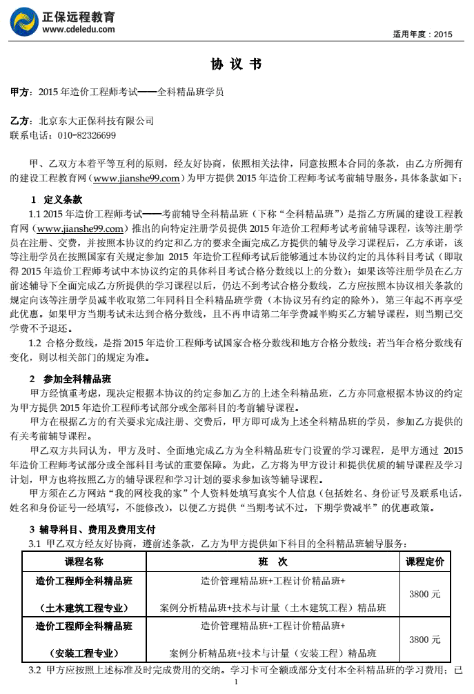造價(jià)工程師“全科精品班”協(xié)議書(shū)