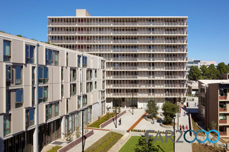 這座C形建筑重塑了1960年代校園里的澆筑混凝土建筑,利用重復的控光板和色彩搭配來(lái)形成蕾絲般的效果,并應對了圣地亞哥的海岸性氣候。宿舍樓主要是為Revell學(xué)院的學(xué)生準備的,拉近了他們與學(xué)院的距離。新的景觀(guān)庭院和籃球場(chǎng)以及附近的會(huì )議室、屋頂平臺和戶(hù)外走道等都推動(dòng)了社會(huì )交流,改善了戶(hù)外居住環(huán)境。
