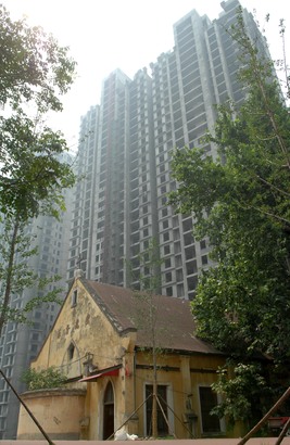 河南省漯河市區,一條秀麗的沙河穿城而過(guò),在老沙河大橋西200米沙河南岸,有座緊挨河堤而建的百年基督教堂,2008年被列為河南省文物保護單位。距教堂不足10米的地方,幾棟30層高樓即將封頂。網(wǎng)友貼圖稱(chēng),高樓太近導致教堂墻體多處被震裂,屋頂土塊成批成批下掉,隨時(shí)有可能坍塌。