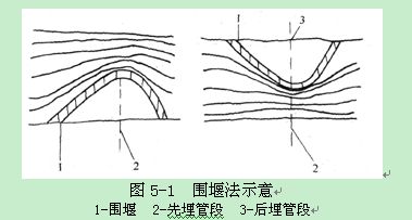 1.圍堰法在待穿越水下管道的兩側,堆筑臨時(shí)堤壩,阻擋水流并排除堤壩間的積水,然后開(kāi)挖溝槽,敷設管道,回填土施工完畢后將圍拆除。這種方法施工簡(jiǎn)單,需要設備少,但必須在斷航的條件下施工。
