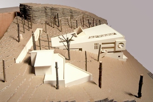 建筑試圖用厚重的體量感和形態(tài)與迪倫馬特一生桀驁不馴,創(chuàng )新求異的個(gè)性相吻合;從基地北面的入口道路看,建筑隱在沿屋面緩級而上的臺階內,留下了足夠的空間給旁邊保留的故居。交通空間為整個(gè)建筑的主線(xiàn), 連接了各個(gè)不同層次的其他主要空間。從入口處視線(xiàn)可以穿透整個(gè)交通空間看到山坡下的城市和湖面。建筑內部空間體穿插、交疊,形成多個(gè)層面。向山下鍥形放大的建筑體構成非常有方向感的,投射而透明的南立面,冷靜而調侃地眺望山下人的城市和湖光山色。