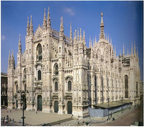 米蘭大教堂是歐洲中世紀最大的教堂,花100年才建成,可供4萬(wàn)人舉行宗教活動(dòng)。教堂全由白色大理石筑成,有135個(gè)尖塔,像濃密的塔林刺向天空,每個(gè)塔尖上有神的雕像。教堂總共有6000多個(gè)雕像,是世界上雕像最多的哥特式教堂。