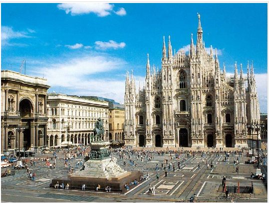 米蘭大教堂由米蘭的第一位公爵(GaleazzoViscontiⅢ)于1386年開(kāi)始興建,各國工程師紛紛設計方案,整個(gè)教堂都是以哥特式的建筑方法來(lái)興建。1500年完成拱頂,并于1577年完成了初步的建筑,開(kāi)始供信奉天主教人士參拜。1774年中央塔上的鍍金圣母瑪麗亞雕像就位。1897年最后完工,歷時(shí)五個(gè)世紀。不僅是米蘭的象征,也是米蘭的中心。拿破侖曾于1805年在米蘭大教堂舉行加冕儀式。