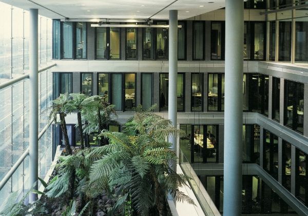 建筑內部開(kāi)放與封閉的空間交替,空間氛圍豐富多樣。中庭、涼廊、庭院花園和天井分布在建筑物的各個(gè)樓層,營(yíng)造出一種單一的連續空間之感,到處都有大量的景致供人欣賞。還有一些可欣賞全景的區域,如餐廳、大會(huì )議室和禮堂,以及更多內向型的工作環(huán)境。