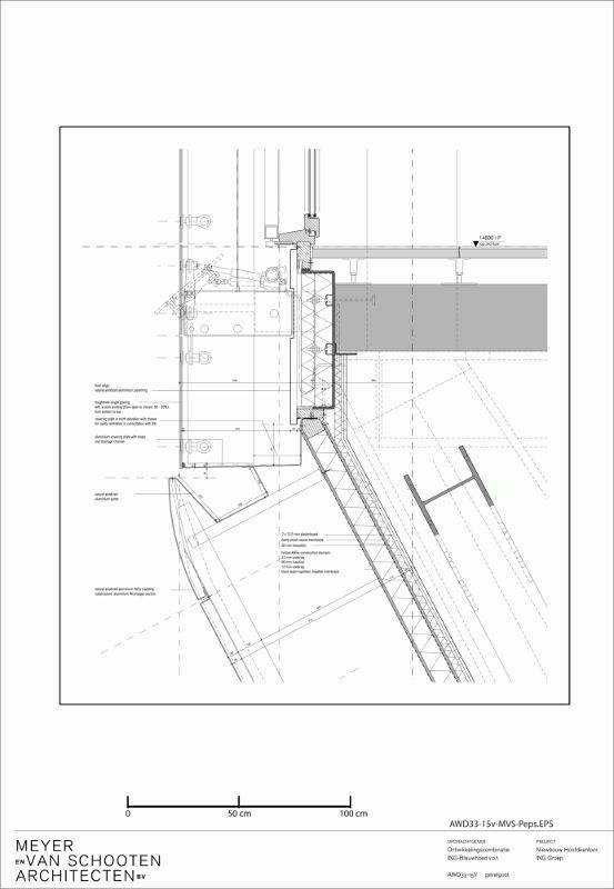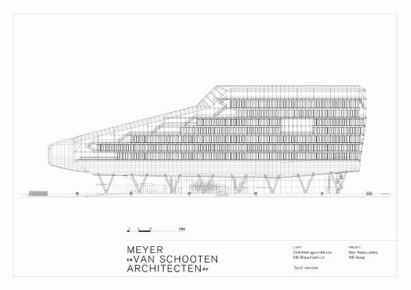 ING集團的總部位于阿姆斯特丹A10號環(huán)形公路南段路邊的一塊狹長(cháng)的地塊上。地塊一側是該市著(zhù)名商業(yè)區South Axis,另一側是環(huán)繞著(zhù)Nieuwe Meer(新湖)的綠地,建筑物在面對綠地一側保持低矮的體量,懸挑結構中是大禮堂,而在面向城市一側抬高。