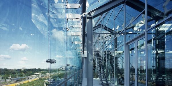 建筑物為呼應其周邊環(huán)境,采取了“智能的”立面設計方式。長(cháng)長(cháng)的南立面必須能應對較高的太陽(yáng)熱負荷,而北立面又面臨來(lái)自A10號高速公路的空氣污染和噪音問(wèn)題。采用雙層立面,就能保證適宜的室內氣候,還能保證自然通風(fēng)。在南側,遮陽(yáng)板懸掛在立面的空腔處;自然的煙囪效應帶走了一部分太陽(yáng)的熱量。臨高速公路一側的玻璃表皮關(guān)閉,空腔中的新鮮空氣是從南側吸過(guò)來(lái)的。