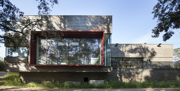 餐廳的位置擺放使得建筑的一端剛好融入樹(shù)林里。擴建部分在場(chǎng)地上的平面布局盡量減少了對樹(shù)林的破壞。餐廳的山形墻基本上是開(kāi)放的,在室內空間與橡樹(shù)林之間營(yíng)造了非常強烈的關(guān)聯(lián)性。正前方的出口都安裝了玻璃窗,因而在帶頂庭院與樹(shù)林之間創(chuàng )建了透明度,并深入到建筑內部。