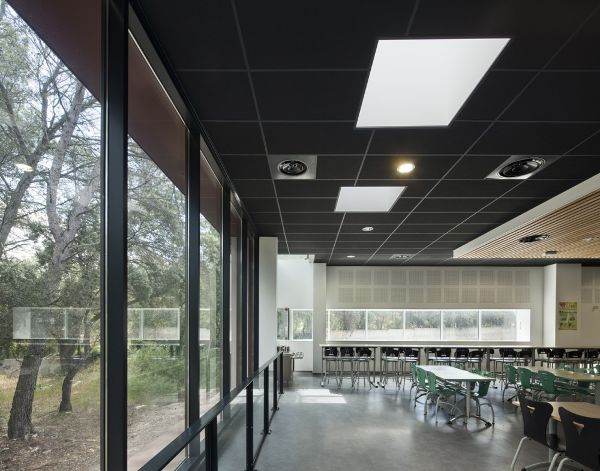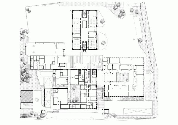 中學(xué)大樓以及即將用于學(xué)校餐廳和多功能室的擴建部分毗鄰采石場(chǎng),采石場(chǎng)在滿(mǎn)是橡樹(shù)的美麗樹(shù)林里。采石場(chǎng)剩余的石料賦予這片綠色空間以特有的風(fēng)格,這也是本項目必須加以強調的地方。
