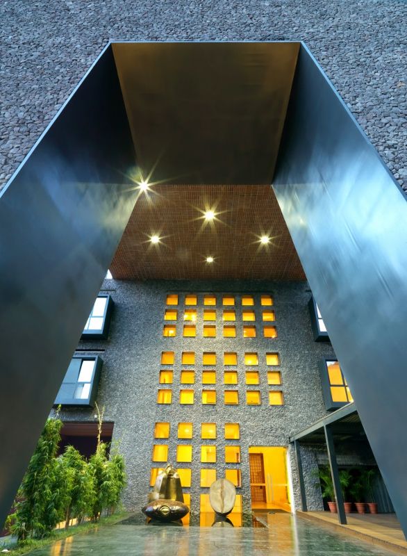 立面的體量設計和材料組合、建筑基座上的火山石和上層體量的磚使建筑看起來(lái)像是由兩個(gè)結構疊加而成的,進(jìn)而為在一層建造露臺和花園預留出空間。一層的露臺和花園與設在建筑上層不同地方的兩個(gè)露臺一起,為人們提供了休閑和沉思的空間。