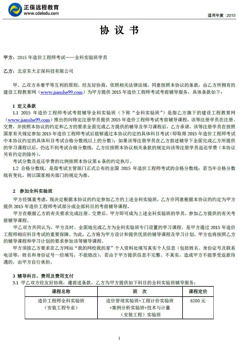 造價(jià)工程師“全科實(shí)驗班”協(xié)議書(shū)