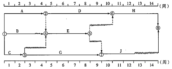 某工程項目雙代號時(shí)標網(wǎng)絡(luò )計劃如下圖所示,其中工作E的總時(shí)差和