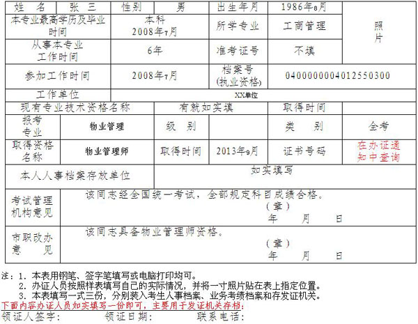 辦理證書(shū)時(shí)考生需出示本人身份證原件,報名時(shí)所需的畢業(yè)證書(shū)原件,單位蓋章的《考試報名條件證明表》一份,2寸照片1張、1寸照片3張(黑白、彩色均可),并填寫(xiě)好《專(zhuān)業(yè)技術(shù)人員資格考試合格登記表》一式三份。其中對符合免試條件的考生,還需按照《關(guān)于做好2013年度物業(yè)管理師資格考試考務(wù)工作的通知》的要求,提供有關(guān)高級職稱(chēng)資格證書(shū)原件或有關(guān)證明材料。