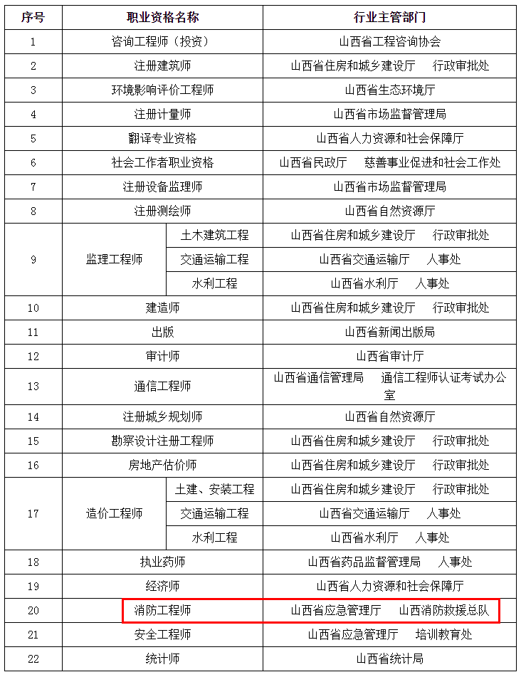 山西省人力資源和社會(huì )保障廳人事考試專(zhuān)欄發(fā)布《山西省專(zhuān)業(yè)技術(shù)人員職業(yè)資格證書(shū)補發(fā)目錄》,其中包含消防工程師證書(shū)。