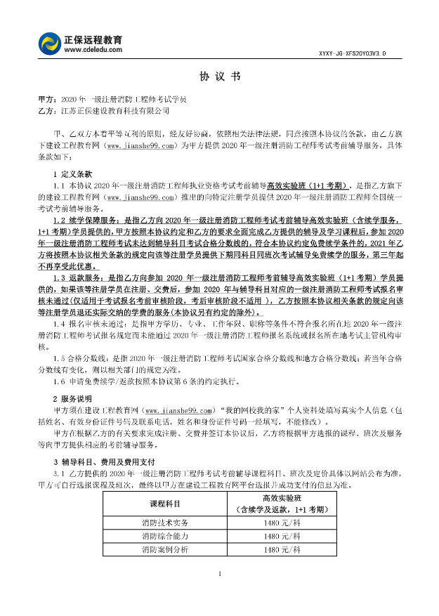2020年一級注冊消防工程師高效實(shí)驗班協(xié)議書(shū)