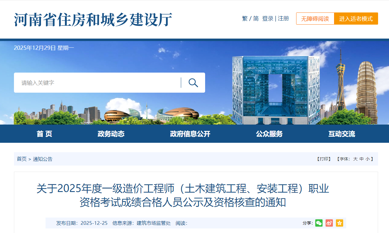 河南省2025年度一級造價(jià)工程師(土建、安裝)考試成績(jì)合格人員公示及資格核查通知