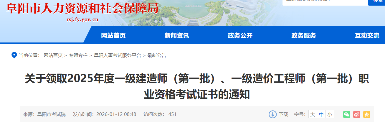 安徽省阜陽市2025年一級(jí)造價(jià)師考試證書領(lǐng)取通知