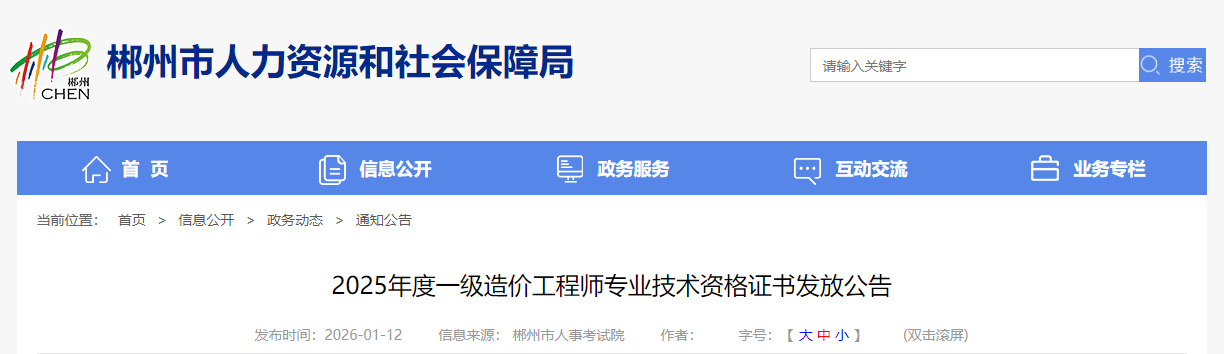 湖南郴州2025年度一級造價(jià)工程師專業(yè)技術(shù)資格證書發(fā)放公告