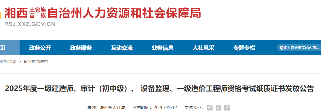 湖南省湘西考點(diǎn)2025年一級(jí)造價(jià)工程師資格考試紙質(zhì)證書發(fā)放公告已發(fā)布,詳情如下: