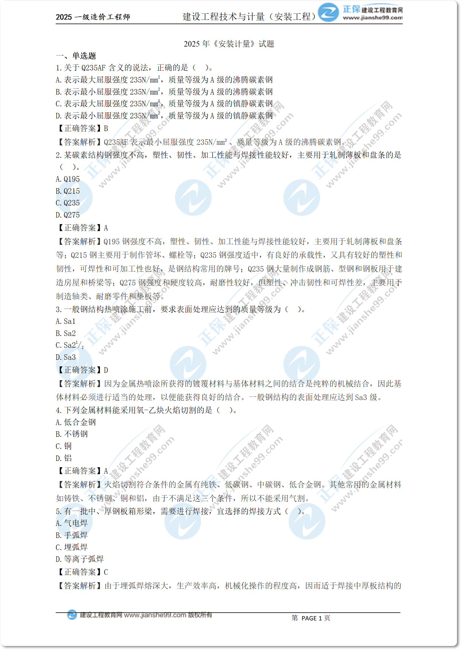 2025年一級造價(jià)師考試《安裝計量》科目真題及答案解析