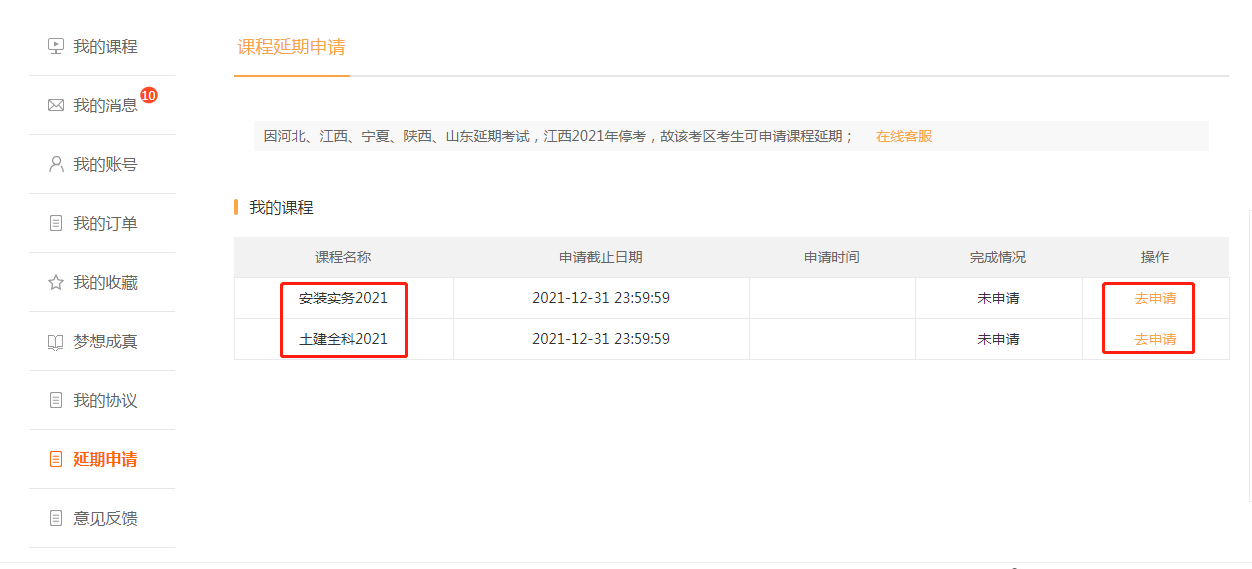 1.電腦登錄“建設工程教育網(wǎng)”進(jìn)入“我的網(wǎng)校我的家”,直接點(diǎn)擊課程上方延期說(shuō)明中的“去申請”