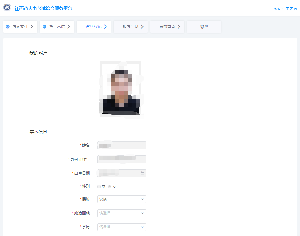 五、先填寫(xiě)“我的資料”,注意照片尺寸要求,填寫(xiě)好民族等個(gè)人信息。