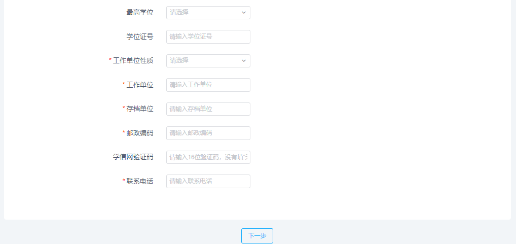 十、資料登記,須填寫(xiě)自己真實(shí)的個(gè)人信息,前邊標注紅色*的內容為必填項,大家一定要全部如實(shí)填寫(xiě),所有資料填寫(xiě)完整,確認無(wú)誤之后點(diǎn)擊“下一步”,即可完成報名第一階段的注冊登記。
