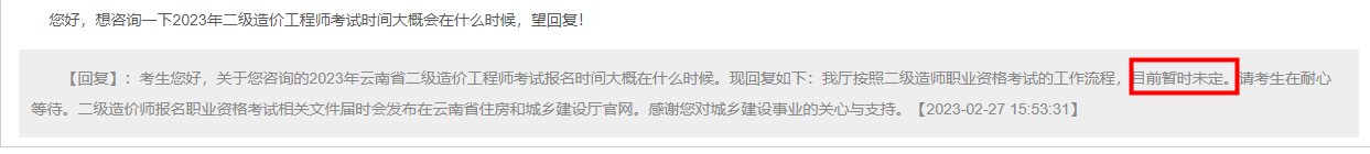 云南省22年二級造價(jià)師補考順利結束,23年考試時(shí)間在什么時(shí)候?近日,有考生就23年二造考試時(shí)間的問(wèn)題詢(xún)問(wèn)了云南省住建廳,得到的回復如下。