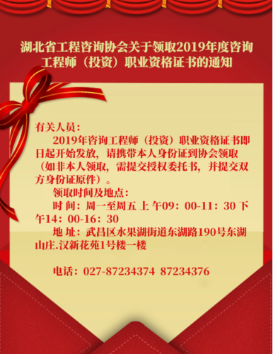 原文鏈接:湖北省工程咨詢(xún)協(xié)會(huì )關(guān)于領(lǐng)取2019年度咨詢(xún)工程師(投資)職業(yè)資格證書(shū)的通知