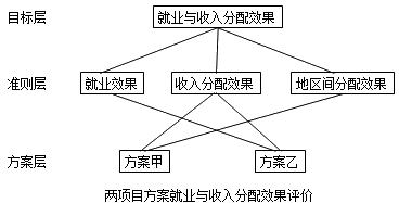 通過(guò)對“就業(yè)效果”、“收入效果”和 “地區間分配效果”三因素兩兩比較。評價(jià)者從對“就業(yè)與收入分配”貢獻的角度,得到的結果寫(xiě)在下面3×3的判斷矩陣中: